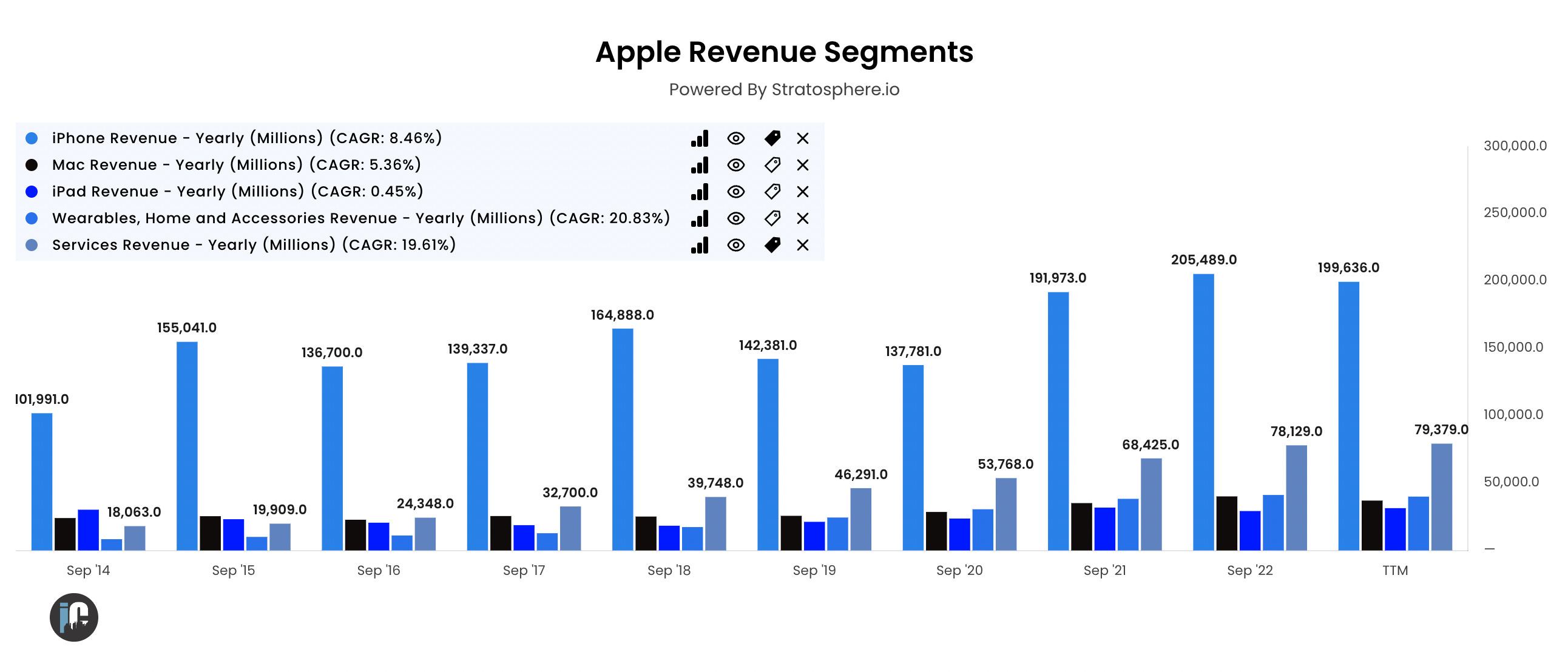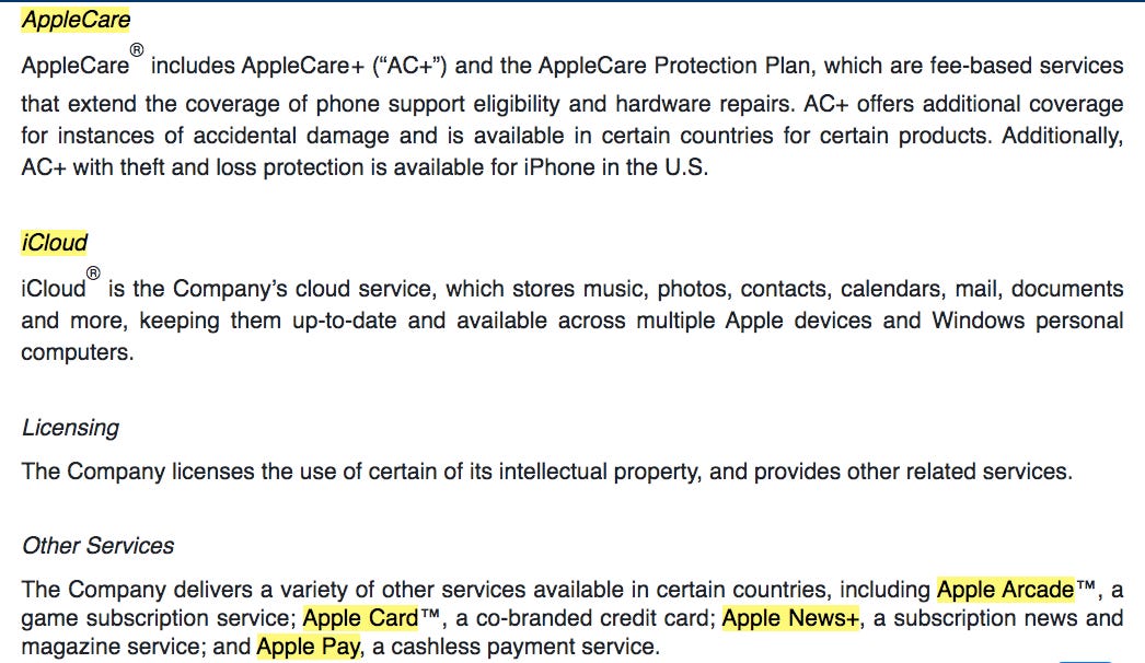 This segment is very interesting because Apple has such a large installed base. In fact, at the last count, the company had sold well over 2.2 billion iPhones and currently has an active installed base of about 1 billion. Add in millions of Macs and iPads and you’ve got a HUGE base of people to sell into. So those first three revenue segments (iPhone, Mac, and iPad) enable the company to sell more services, which increases the stickiness of the ecosystem.
