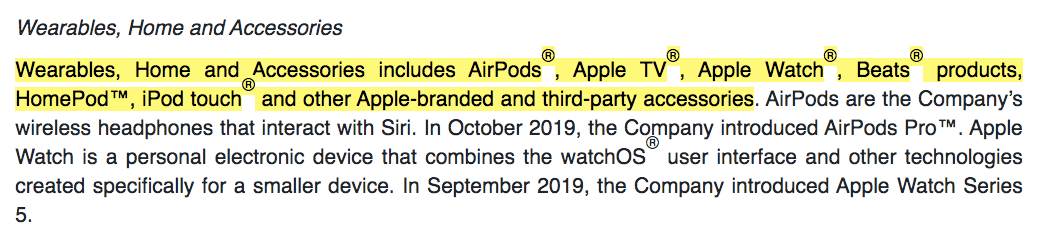 The two biggest drivers for this segment (Wearables aka “Other Products”) are likely AirPods and the Apple Watch.