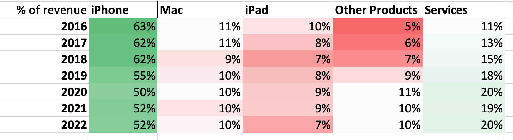 You can see that the iPhone is shrinking a little as a proportion of sales but it still makes up the majority. This decline has been offset by the “Other Products” and “Services” segments.
