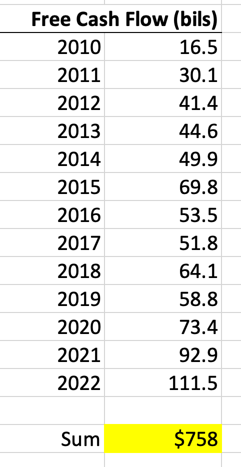 Over the last 13 years, Apple hauled in over a quarter trillion in free cash flow ($758 billion to be exact).