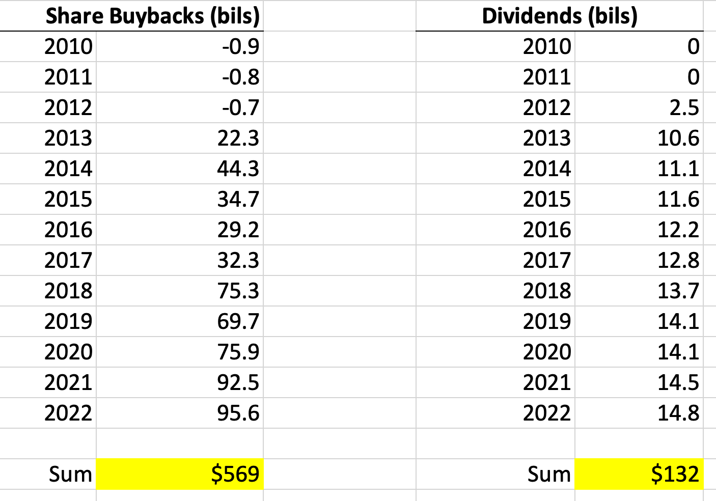 Since 2010, Apple has paid out $132 billion in dividends and bought back a whopping $569 billion of its own stock.