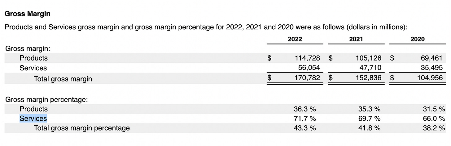 And the services have gross margins that are twice as high as the products, at 72% vs. 36%.