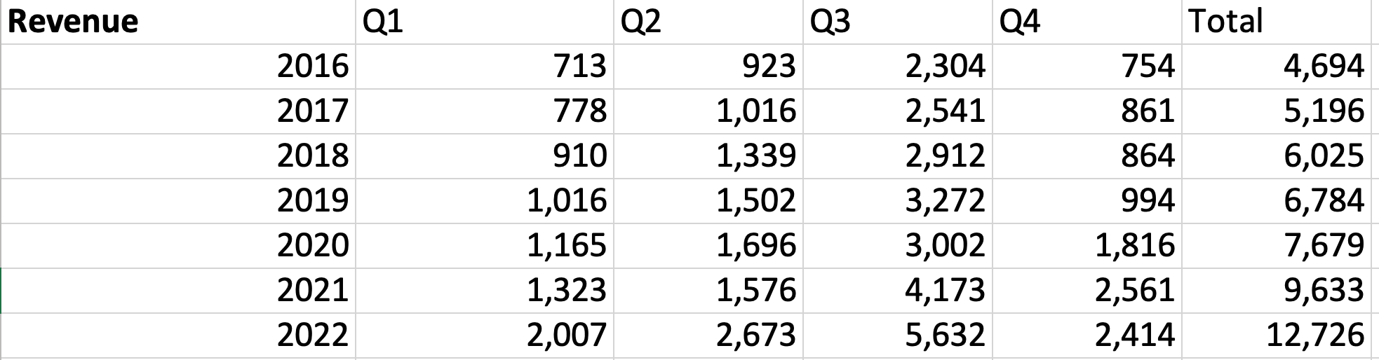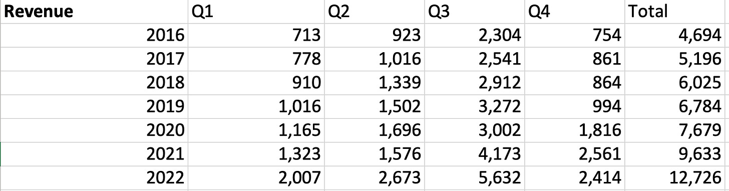 You can see that Q2 and Q3 are the biggest revenue quarters, with Q3, being the real driver.