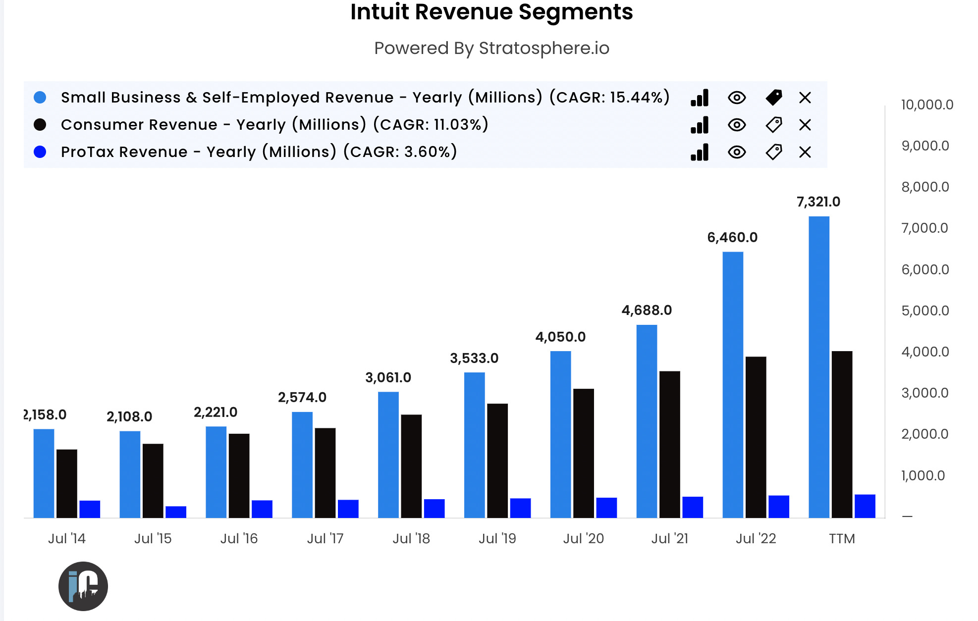 The Small Business segment offers products and services for small businesses, including QuickBooks, payroll, and payment processing solutions. This segment also includes the company's self-employed and freelancer product lines, such as TurboTax Self-Employed and QuickBooks Self-Employed. The company somewhat recently bought Mailchimp $12 billion to bolster this segment. Mailchimp is an email marketing platform that has morphed into a website builder as well.