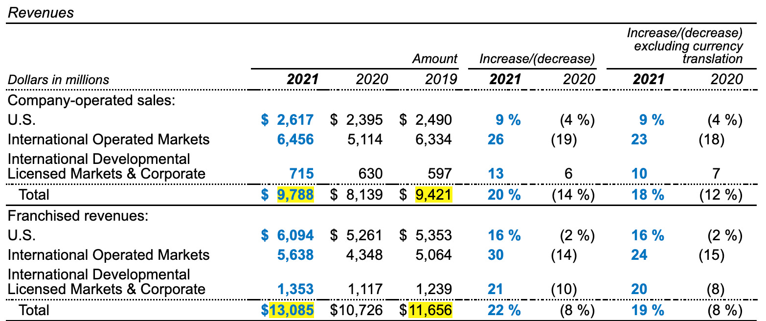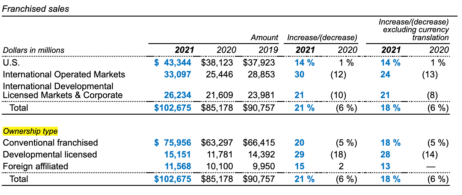 You can think of McDonald’s business as having a take-rate, similar to how Amazon’s revenue is a percentage of total sales that flow through the system. McDonald’s franchisees did $102 billion in revenue but McDonald’s did $13 billion in revenue on that, like a 13% take-rate. Moreover, the gross margin (what the company calls restaurant operating margin) was 81% on that revenue.