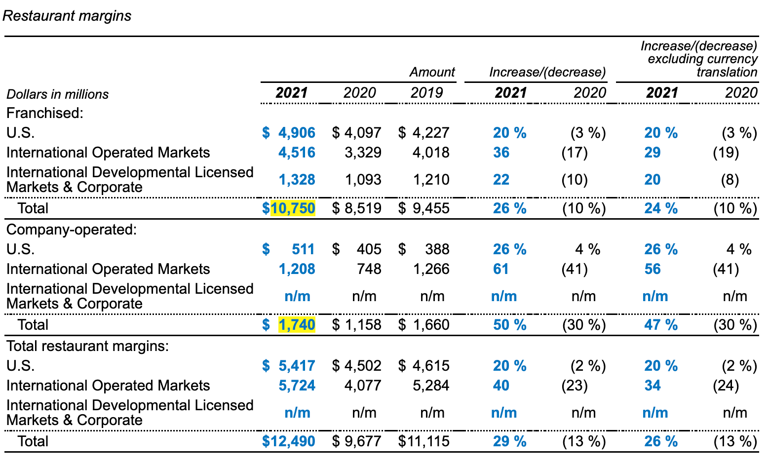 To put the numbers another way, company-owned restaurants accounted for $9.8 billion of the company’s $23 billion in revenue (43%). However, they accounted for 9% of total sales that flowed through all restaurants. That’s because the “take-rate” for company-owned stores is 100%, there is no royalty. So despite company-owned stores making up 43% of revenue, they only accounted for 14% of restaurant margin. The sweet power of the franchise margin, while McDonald’s is about to own the underlying real estate.