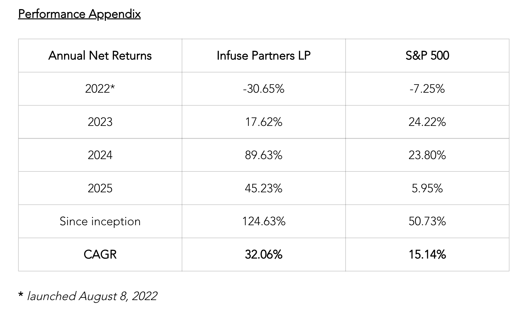 The information in this material is only current as of the date indicated and may be superseded by subsequent market events or for other reasons. Statements concerning financial market trends are based on current market conditions, which will fluctuate. Any statements of opinion constitute only current opinions of Infuse which are subject to change and which Infuse does not undertake to update. Due to, among other things, the volatile nature of the markets, an investment in the fund/partnership may only be suitable for certain investors. Parties should independently investigate any investment strategy or manager, and should consult with qualified investment, legal and tax professionals before making any investment.