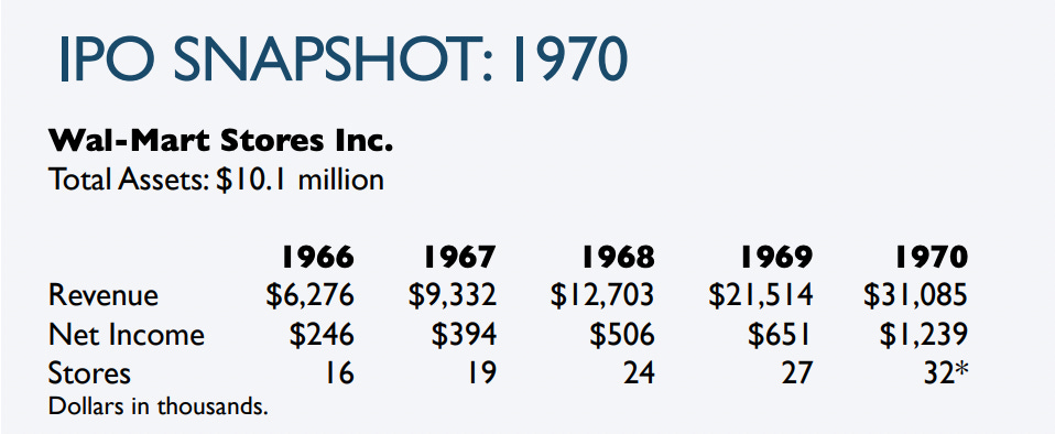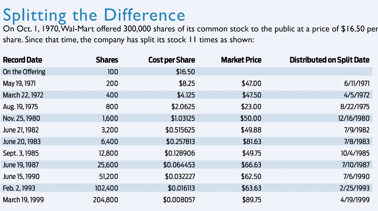 There’s this awesome story that comes from the 1987 annual shareholders meeting where the CFO at the time, Jack Shewmaker, says a Vietnam veteran’s widow found 200 Walmart shares in a closet that her husband had bought in 1970. Factoring in the seven splits since they were issued, she held 40,000 shares worth $1.7 million.