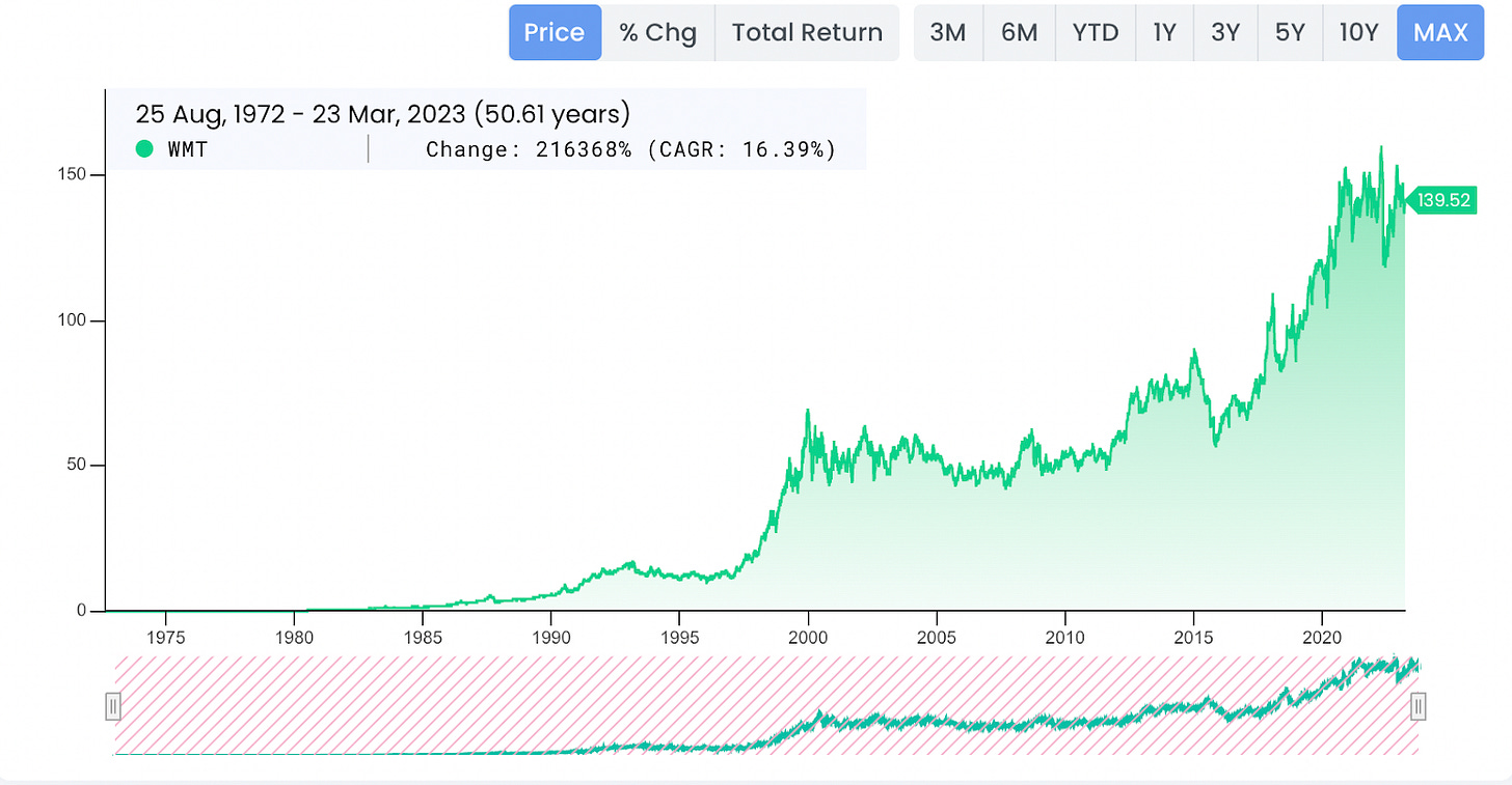 Walmart has been on the New York Stock Exchange since August 25, 1972. In that time, the stock has compounded at over 16%, more than a 2,000 bagger.