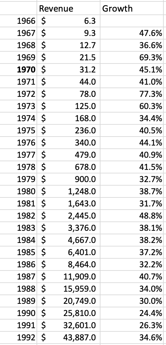 From $31 million in sales at the 1970 IPO to $611 billion last year, the legacy that Sam Walton started lives on. What’s wild is just how measured growth was under Mr. Walton. Sam got sick in 1990 when he was diagnosed with bone cancer. Up until that point, the company didn’t have a single year of sub-30% growth! That is just unbelievable. Under Walton’s leadership, before 1990, that was 28 straight years of more than 30% growth. Talk about compounding!
