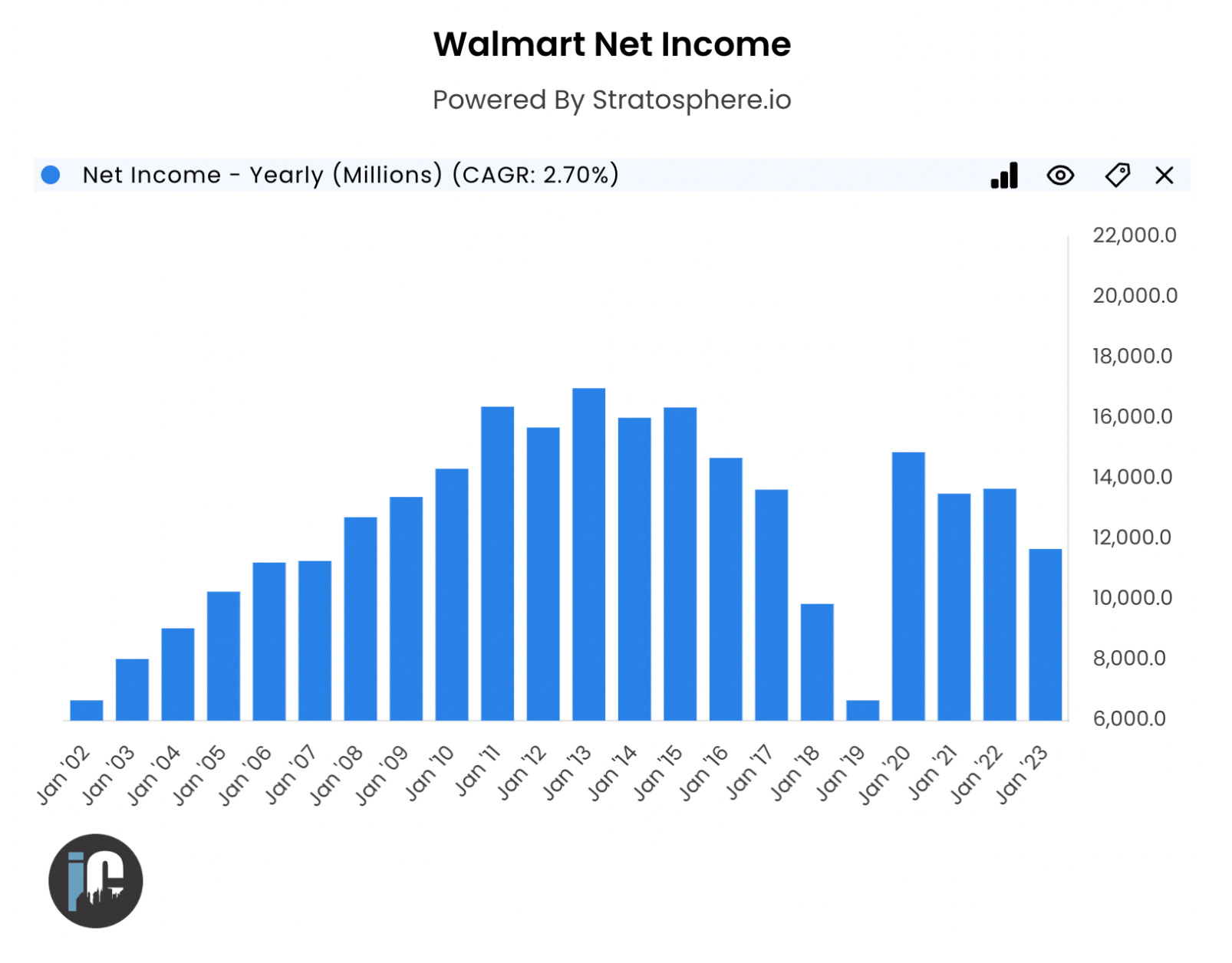 In fact, it wasn’t until 1996 that Walmart had its first earnings decline. It only took 26 years! While Sam was at the helm, there wasn’t a single year of earnings decline. I can’t emphasize enough how impressive that is. 30 years at the helm (though there was one year where Walton retired in 1974 before coming back) and not one year where earnings went down.